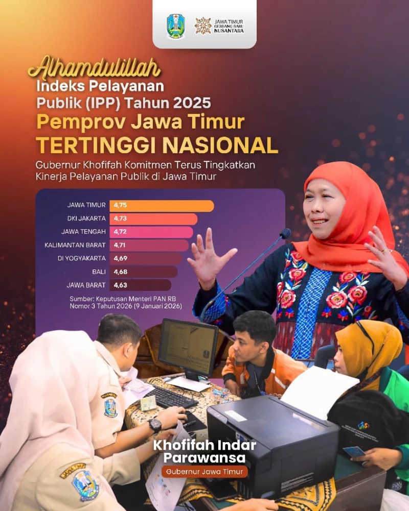 “Alhamdulillah, berdasarkan penetapan Kementerian PANRB, Jawa Timur dinyatakan sebagai provinsi dengan kinerja pelayanan publik terbaik tahun 2025. Ini bukan sekadar prestasi, tetapi amanah untuk terus menjaga dan meningkatkan kualitas pelayanan kepada masyarakat,” ujar Khofifah di Surabaya, Senin (12/1).