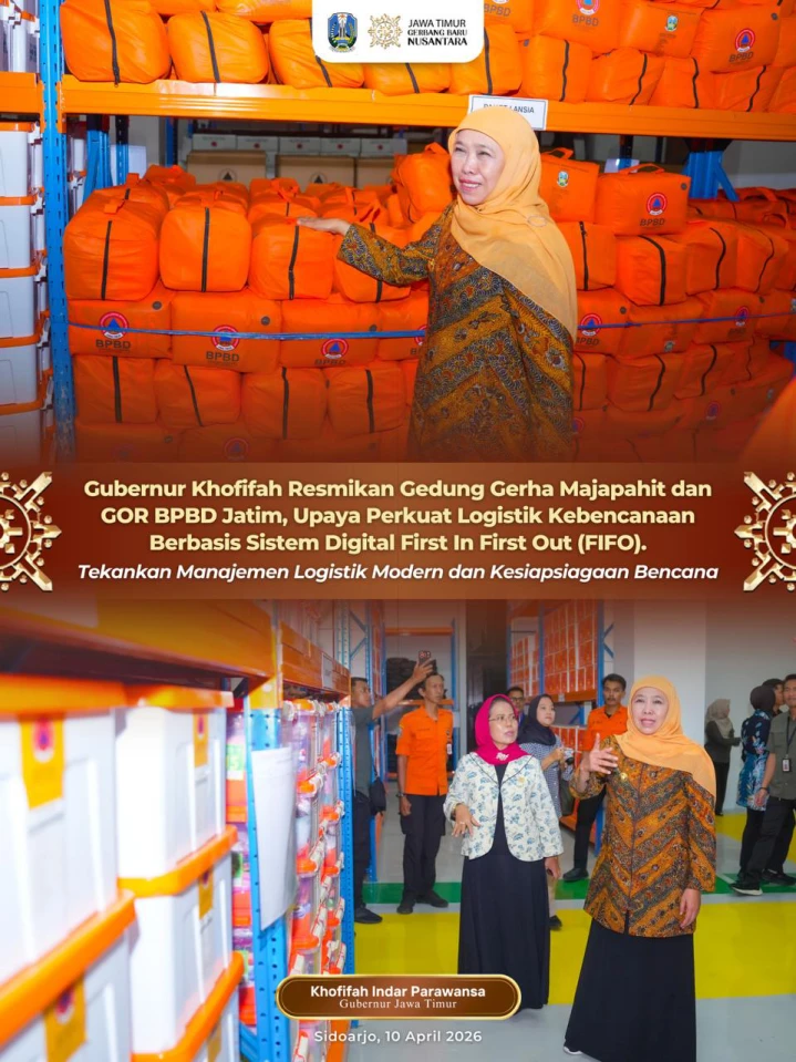 PIKIRANKITA.ID – SIDOARJO, 10 April 2026 – Gubernur Jawa Timur Khofifah Indar Parawansa meresmikan Gedung Gerha Majapahit dan Gedung Olahraga Badan Penanggulangan Bencana Daerah (BPBD) Provinsi Jawa Timur di Kantor BPBD Jatim, Kabupaten Sidoarjo, Kamis (9/4).